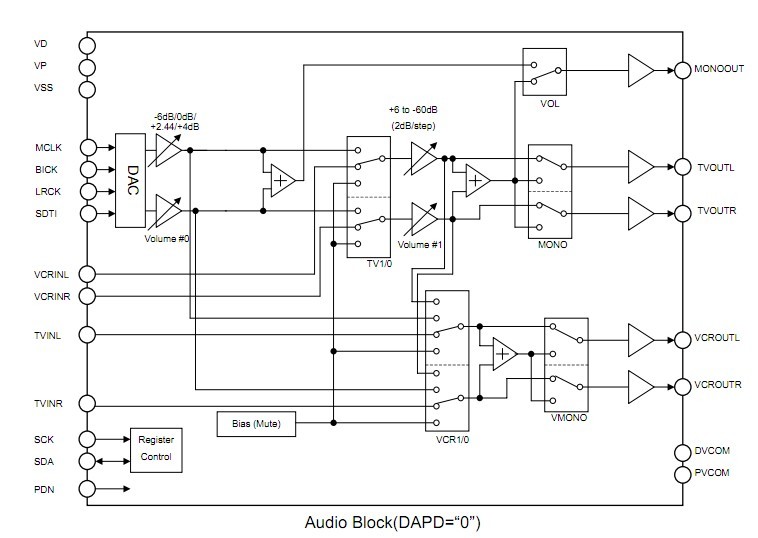 4705AEQ absolute maximum ratings: (1)Power Supply, VD: -0.3 to 6.0V; VVD1: -0.3 to 6.0V; VVD2: -0.3 to 6.0V; VP: -0.3- to 14V ; (2)Input Current (any pins except for supplies), IIN: ±10mA; (3)Input Voltage, VIND: -0.3 to VD+0.3V ; (4)Video Input Voltage, VINV: -0.3 to VVD1+0.3V; (5)Audio Input Voltage (except DACL/R pins), VINA: -0.3 to VP+0.3V; (6)Audio Input Voltage (DACL/R pins), VINA: -0.3 to VD+0.3V; (7)Ambient Operating Temperature, Ta: -10 to 70℃; (8)Storage Temperature, Tstg: -65 to 150℃.