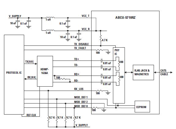 AFBR-57R5APZ features: (1)RoHS-6 Compliant (see Table 1); (2)Designed for Industry-Standard, MSA Compliant Small Form Factor Pluggable (SFP) Ports; (3)Compatible with IEEE 802.3:2000; (4)Custom RJ-45 connector with integrated magnetics; (5)Link lengths at 1.25 Gbd: up to 100 m per IEEE802.3; (6)Low power, high performance 1.25 Gbd SerDes integrated in module; (7)Single +3.3 V power supply operation; (8)Auto-negotiation per IEEE 802.3:2000 Clause 28 (Twisted Pair) and Clause 37 (1000BASE-X); (9)Compatible to both shielded and unshielded twisted pair category 5 cable; (10)Two confi gurations: ABCU-5700RZ: RX_LOS enabled; ABCU-5710RZ: RX_LOS disabled; (11)Rated for Commercial Temperature applications (0 - 70℃); (12)10/100/1000 BASE-T operation in host systems with SGMII interface.