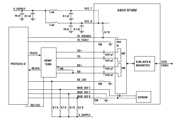 AFBR-57R7APZ-HW features: (1)RoHS-6 Compliant (see Table 1); (2)Designed for Industry-Standard, MSA Compliant Small Form Factor Pluggable (SFP) Ports; (3)Compatible with IEEE 802.3:2000; (4)Custom RJ-45 connector with integrated magnetics; (5)Link lengths at 1.25 Gbd: up to 100 m per IEEE802.3; (6)Low power, high performance 1.25 Gbd SerDes integrated in module; (7)Single +3.3 V power supply operation; (8)Auto-negotiation per IEEE 802.3:2000 Clause 28 (Twisted Pair) and Clause 37 (1000BASE-X); (9)Compatible to both shielded and unshielded twisted pair category 5 cable; (10)Two confi gurations: ABCU-5700RZ: RX_LOS enabled; ABCU-5710RZ: RX_LOS disabled; (11)Rated for Commercial Temperature applications (0 - 70℃); (12)10/100/1000 BASE-T operation in host systems with SGMII interface.