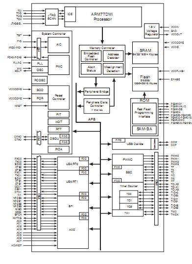 AT91SAM7S256-AU features: (1)High-performance 32-bit RISC Architecture; (2)High-density 16-bit Instruction Set; (3)Leader in MIPS/Watt; (4)EmbeddedICE In-circuit Emulation, Debug Communication Channel Support; (5)Embedded Flash Controller, Abort Status and Misalignment ; (6)Based on Power-on Reset and Low-power Factory-calibrated Brown-out Detector; (7)Provides External Reset Signal Shaping and Reset Source Status; (8)Low-power RC Oscillator, 3 to 20 MHz On-chip Oscillator and one PLL; (9)Software Power Optimization Capabilities, Including Slow Clock Mode (Down to 500 Hz) and Idle Mode; (10)Three Programmable External Clock Signals; (11)2-wire UART and Support for Debug Communication Channel interrupt, Programmable ICE Access Prevention; (12)Mode for General Purpose 2-wire UART Serial Communication; (13)20-bit Programmable Counter plus 12-bit Interval Counter; (14)12-bit key-protected Programmable Counter; (15)Provides Reset or Interrupt Signals to the System; (16)32-bit Free-running Counter with Alarm; (17)Runs Off the Internal RC Oscillator; (18)Input Change Interrupt Capability on Each I/O Line; (19)Individually Programmable Open-drain, Pull-up resistor and Synchronous Output.
